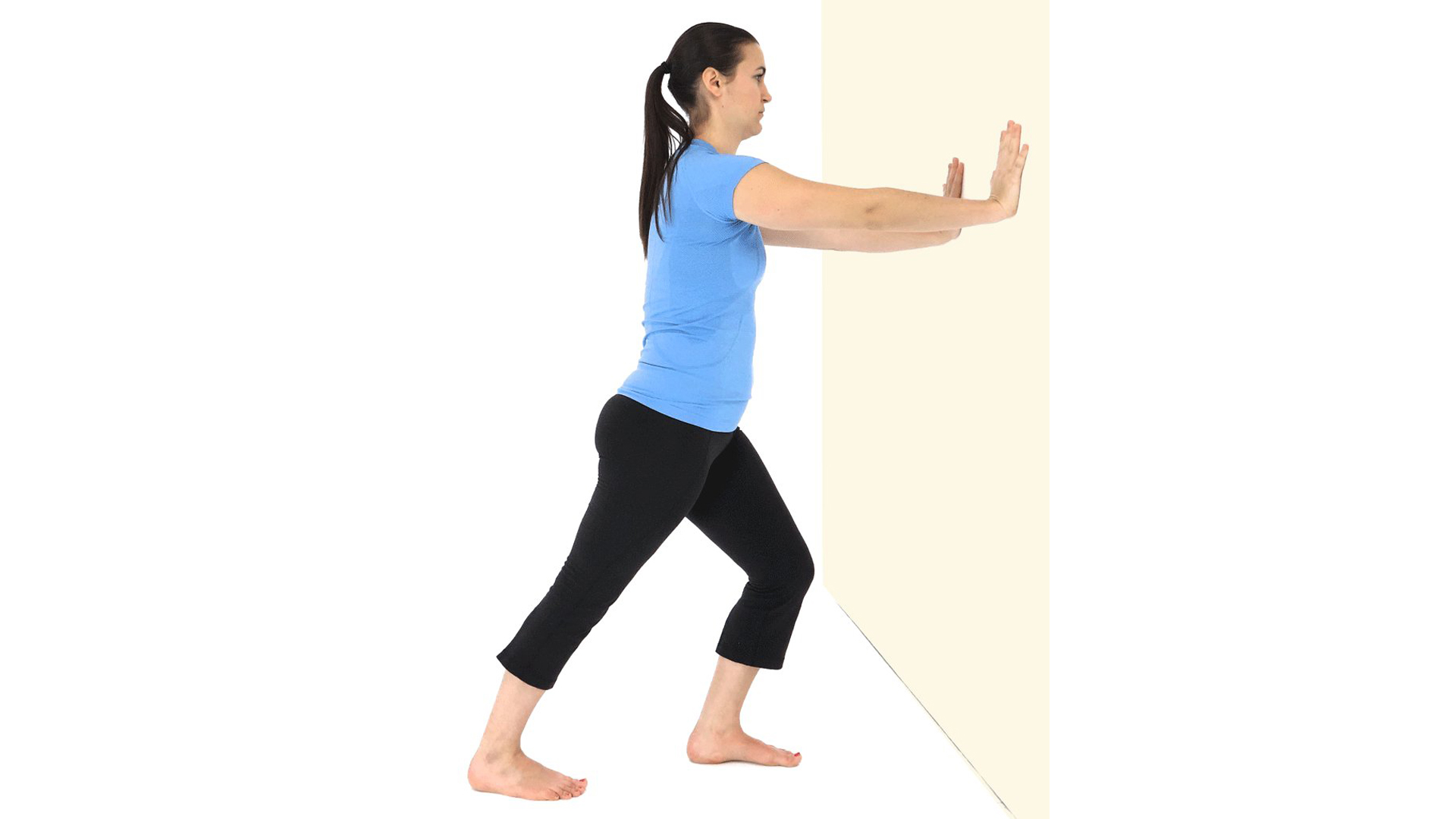 Keep both feet pointed forward and bend your front knee until you feel a stretch in your back calf.