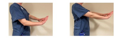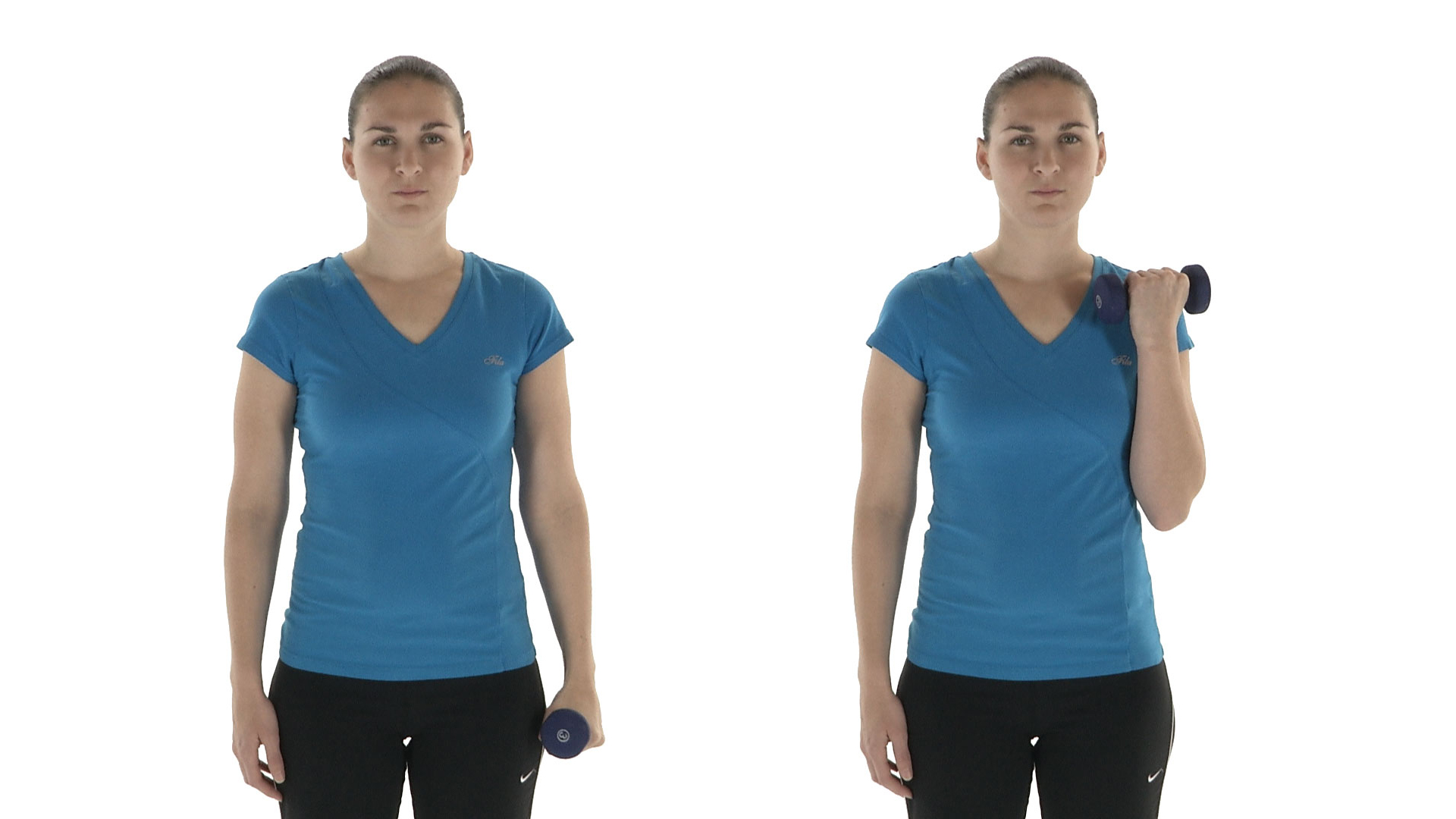 This time, using a light weight, lower your hand down by your side with your palm facing down. Bend your elbow again but with your palm facing up.